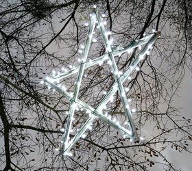 This year we made outdoor wood stars for the trees in instead of our traditional lights on the house. Not only are they beautiful to look at, but the whole family got involved in making them. My husband has been wanting to make the stars for years, but I always opt for the strands of lights that we hang on the house.We had a combination of 8 foot and 4 foot stars hanging on our trees in the front and side of the house. They are hung with heavy gauge wire.